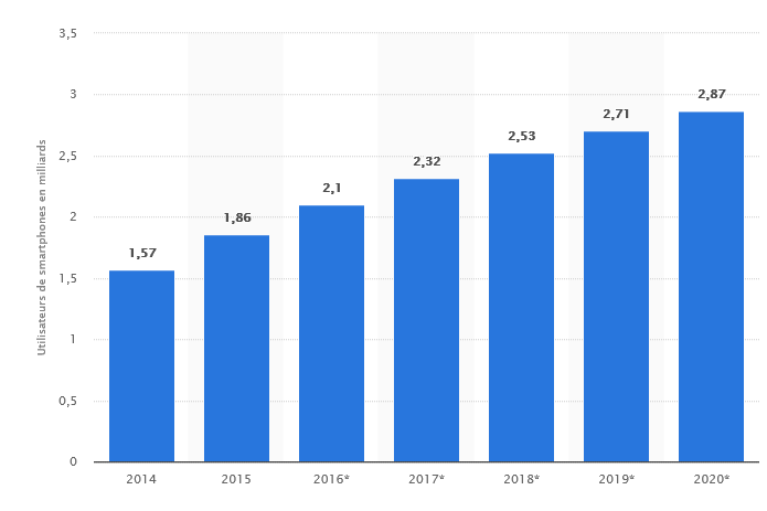 On pourra conclure ce petit article avec un graphique très parlant, qui représente le nombre d’utilisateurs du smartphone selon les années (prévisions pour 2020). Le smartphone étend de plus en plus son influence et le nombre de ses utilisateurs se compte en milliards… L’ère du smartphone n’est pas près de s’arrêter …